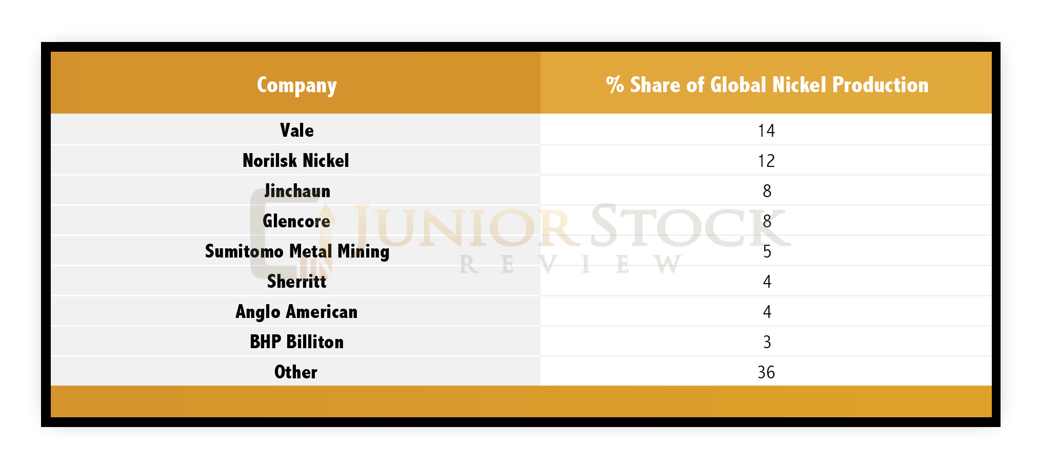 Roughly, 60% of the world’s nickel production is from major mining companies, which, in my mind, means that good nickel deposits are typically bought up in the market by the majors versus being developed by the junior that discovers them.