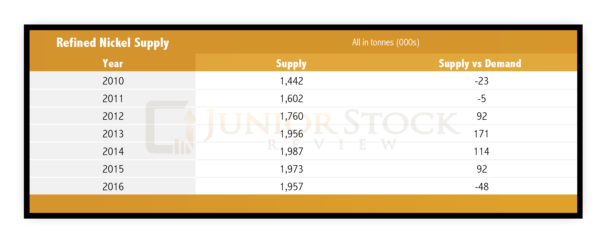 • 2016 marked the first year in the last 5 where the nickel supply was out-stripped by demand.