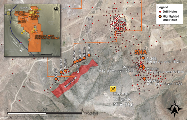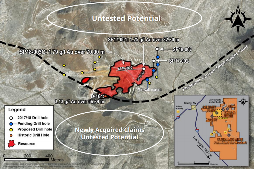 Interestingly, the SNA Deposit lies in close proximity to Corvus Gold’s Claim boundary, and more importantly, their Mother Lode open pit. In the satellite image below, you can see Corvus Gold’s claim boundary outlined in orange, along with Northern Empire’s SNA Deposit toward the bottom right.