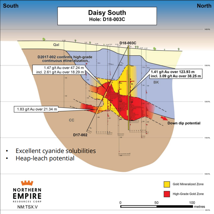 PUSH: 10 holes are planned for Daisy Deposit in the 2018 drill program. As mentioned above, one stellar drill intercept has already been released, assaying 1.41 g/t over 123.93m, a great result. Watch for more drill results from Daisy in the weeks ahead, as Northern Empire looks to expand the Daisy Resource down dip.