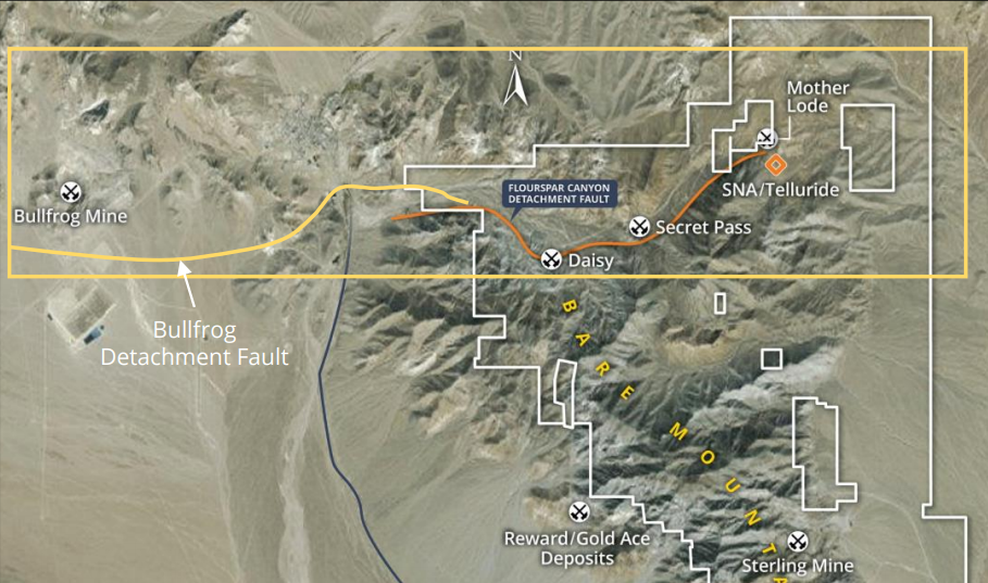 The Sterling Gold Project’s north end is occupied by the Crown Block, which is further broken down into 4 main targets: Daisy Deposit, Secret Pass Deposit, SNA Deposit and Shear Zone. The target mineralization which is found in the Crown Block is concentrated around the same detachment fault structure that hosted Barrick Gold’s past producing, roughly 2.3 million ounce Bullfrog gold mine.
