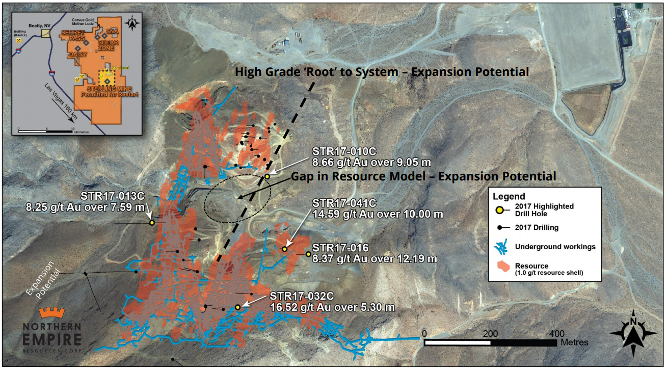 In Corvus Gold’s 2017 drill program, they hit 51.8m of 1.86 g/t gold which included an interval of 19.8m of 3.43 g/t. The reason I mention this is because the hole was located roughly 8 meters from the claim boundary with Northern Empire. As you can see in the satellite image, Northern Empire’s property completely surrounds Corvus Gold’s Mother Lode deposit and needless to say, makes this is a very intriguing target area with a lot of potential for Northern Empire!