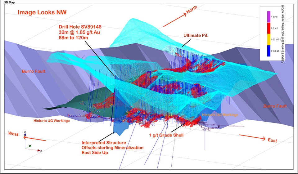 As well, in the computer-generated Sterling Mine model image, you can gain a better perspective on the 3 dimensional open pit shell and the location and orientation of the Burro Fault, which is thought to be one of the most important structures for the deposit. Other minor faults in the area trend north to north-northeast and are important in terms of the future exploration of the Sterling Mine area. As the Technical Report states,