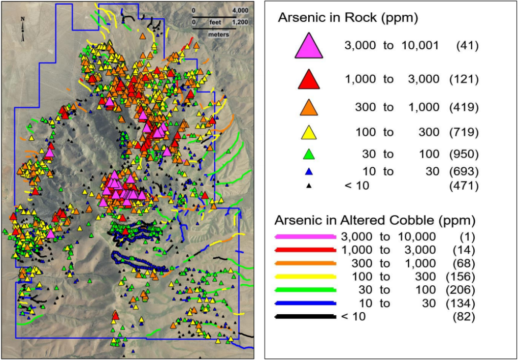 The arsenic samples in particular provide us with a clear visual concentration along the northwest trend, and also appear to follow a secondary structure to the southwest.